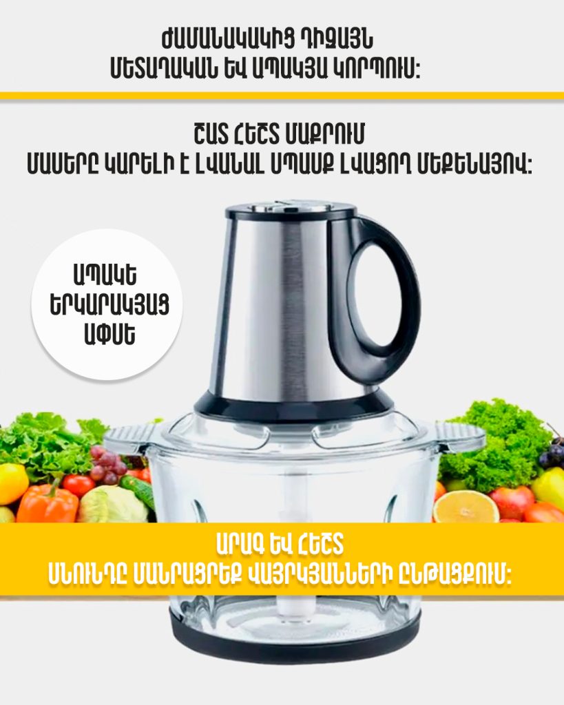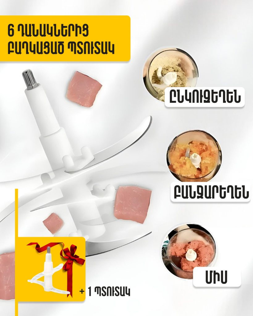 Հեշտացրեք ձեր խոհանոցային աշխատանքները այս բազմաֆունկցիոնալ էլեկտրական մանրացուցիչով։ Այն կատարյալ է բանջարեղեն, միս, պանիր, ընկույզ և այլ մթերքներ արագ ու արդյունավետ մանրացնելու համար: